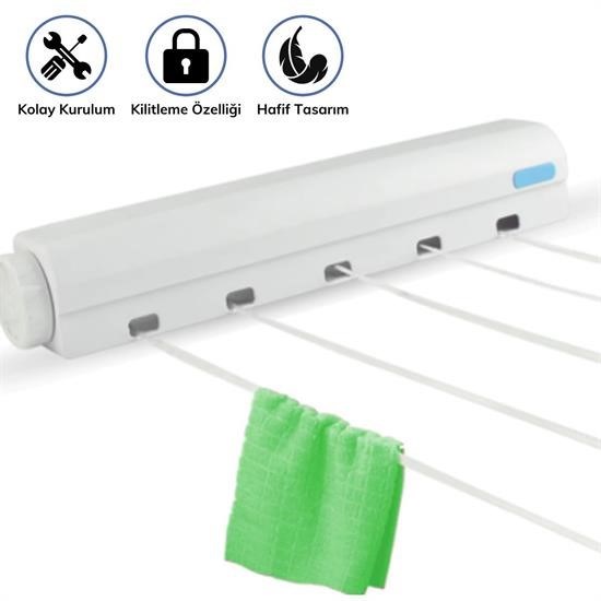 Çamaşır kurutma askısının, bir ucunu duvara sabitliyorsunuz ve çamaşır asacağınız zaman çekip diğer duvardaki aparata takıyorsunuz Anında 4 ipli 39m çamaşır asma kurutmalağınız hazır!