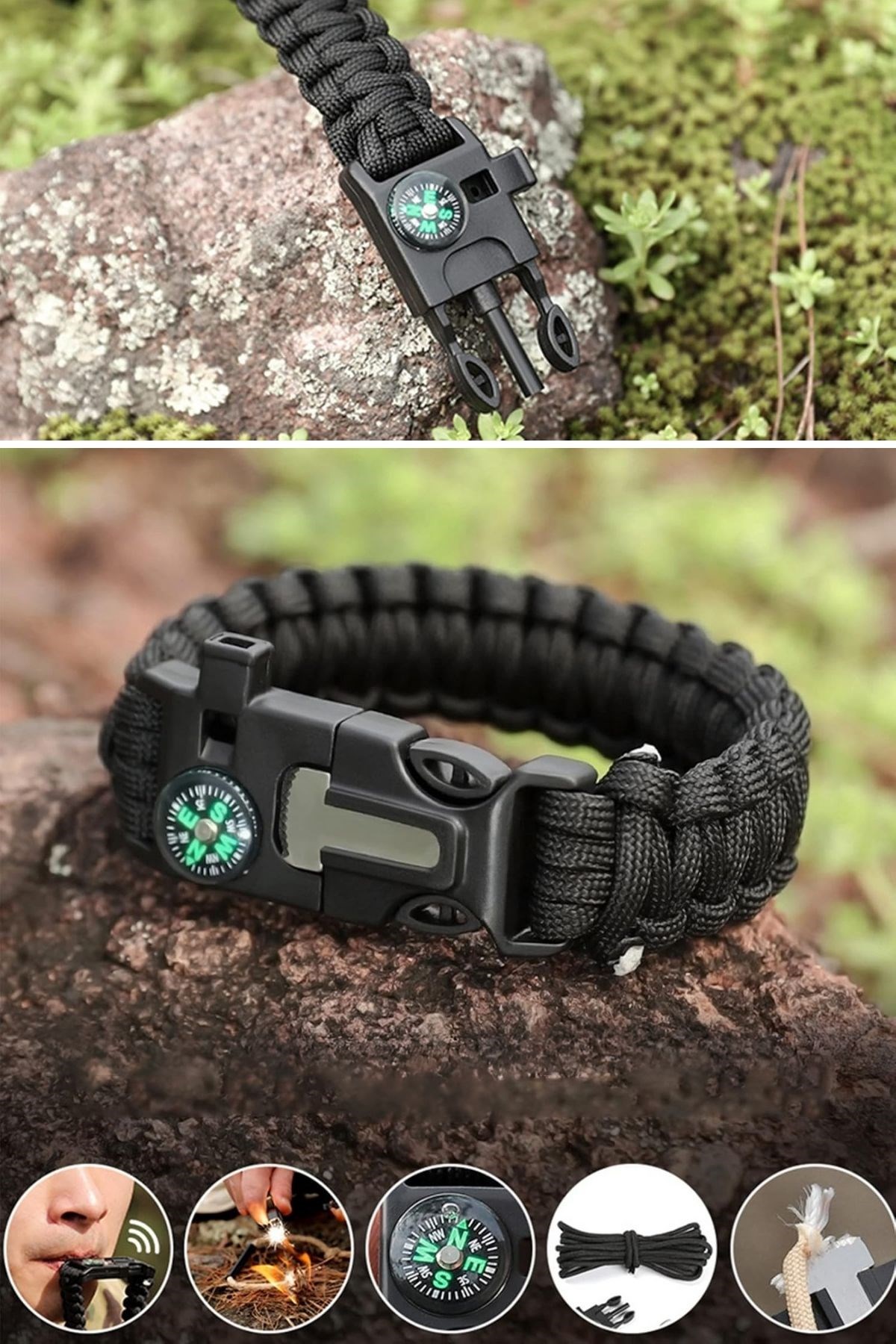 SELFTREND® 5’i 1 Arada Çok Fonksiyonlu Hayatta Kalma Bilekliği Pusula, Düdük, Çakmak Taşı ve Şemsiye İpi Bileklik